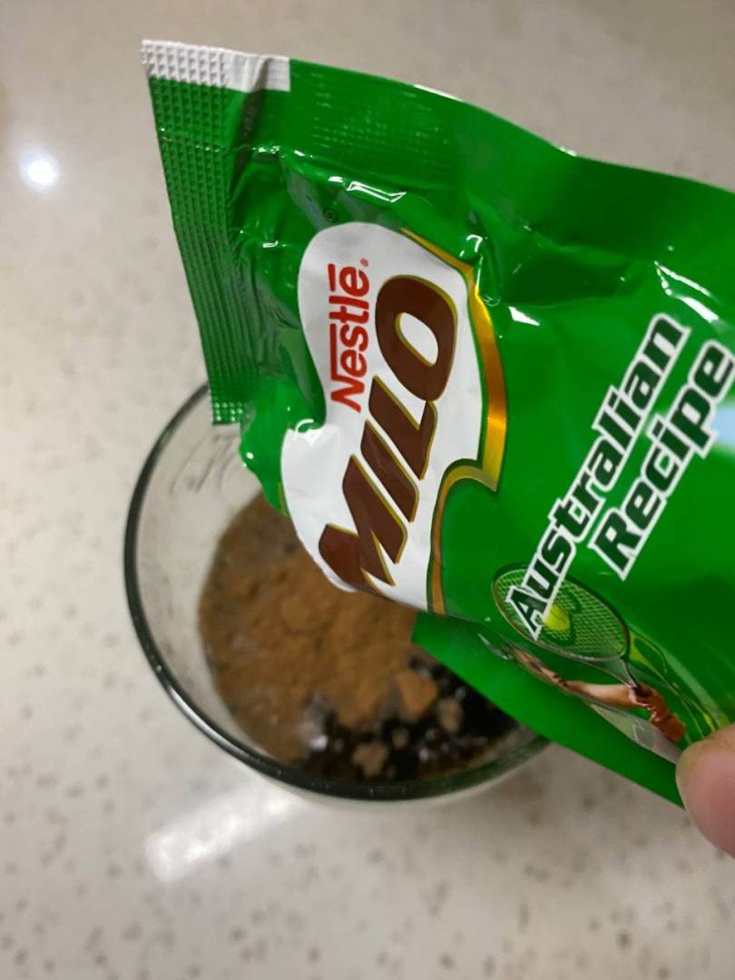 1. Letak ais siap-siap dalam gelas. Masukkan satu sachet serbuk milo dalam gelas.