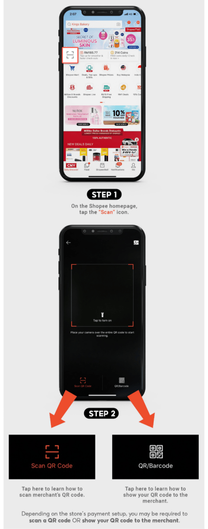 Langkah 2: Imbas kod QR ShopeePay (atau kod QR dari platform digital e-dompet yang lain) yang terpapar di kedai tersebut.