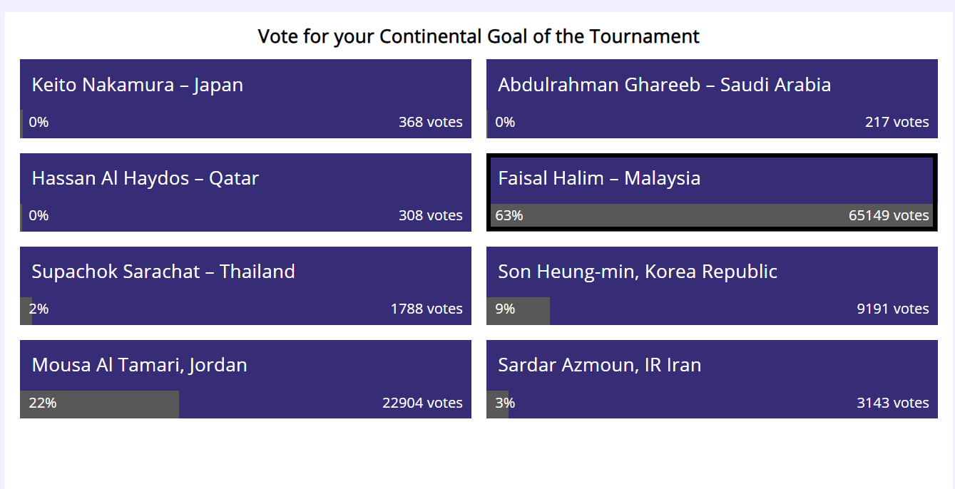 Ketika ini gol Faisal Halim sedang menggungguli carta undian sebanyak 63% daripada keseluruhan undian, jauh meninggalkan pesaing lain.
