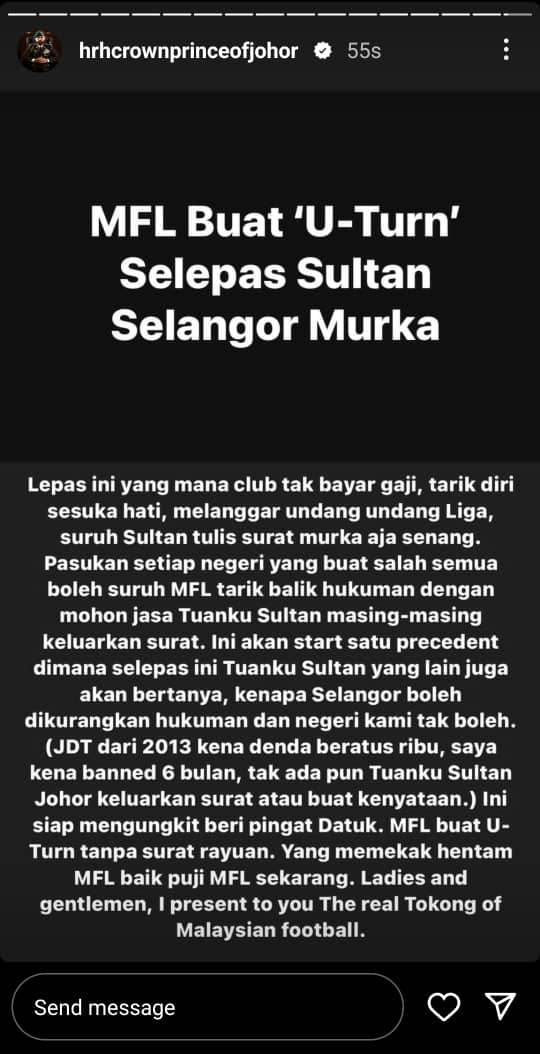 “JDT daripada 2013 kena denda beratus ribu, saya kena ‘banned’ 6 bulan, tidak ada pun Tuanku Sultan Johor keluarkan surat atau buat kenyataan. Siap mengungkit beri pingat Datuk. MFL buat ‘U-Turn’ tanpa surat rayuan. Yang memekak hentam MFL baik puji MFL sekarang.