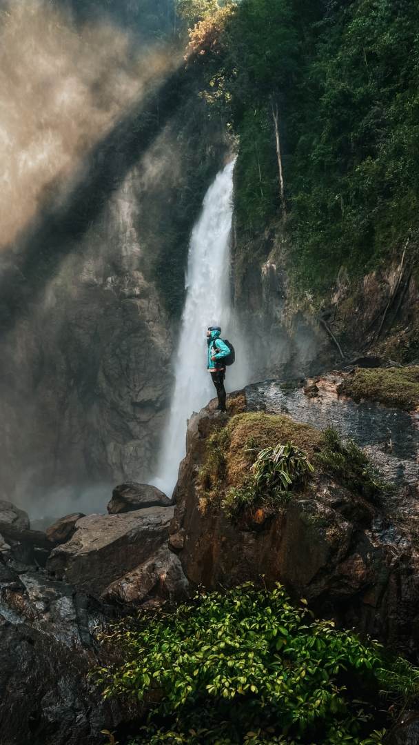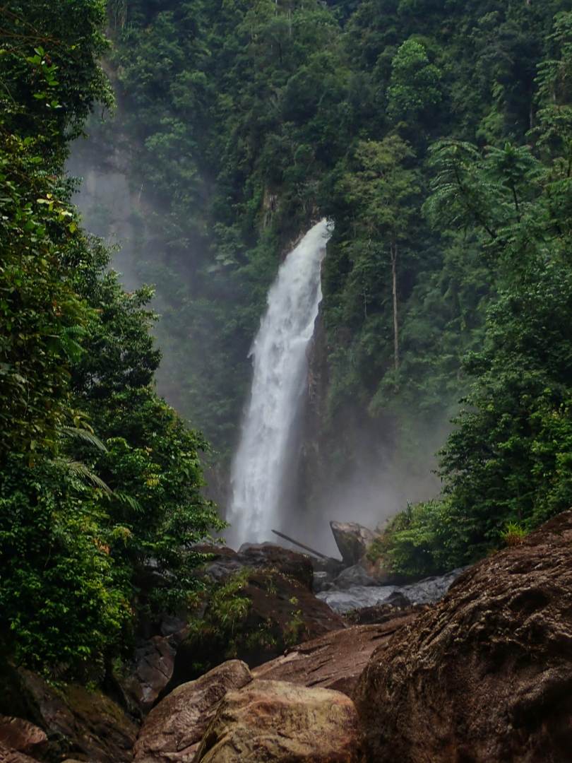 "Deruan air terjun berdebu berbunyi garang dapat didengari dari jauh memecah kesunyian belantara. Terjunan air yang tinggi dan garang. Saya sarankan pengunjung memakai baju kalis air atau baju hujan bersama barang elektronik dan berharga perlu disimpan di dalam beg kalis air.