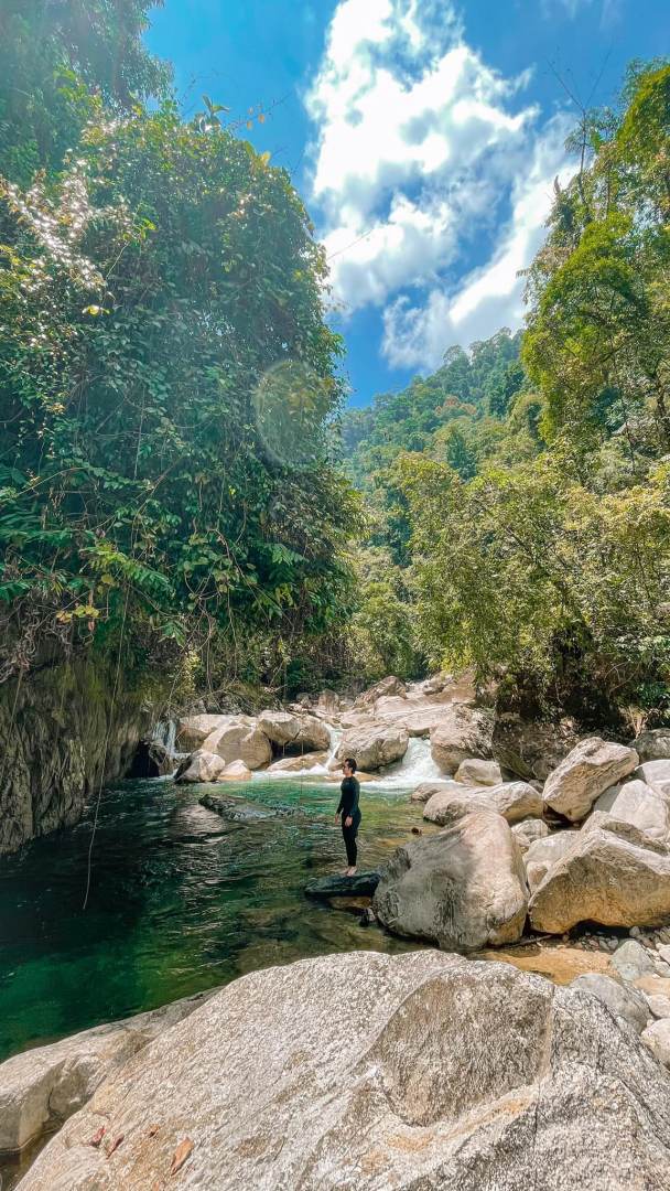 Selain persekitaran yang hijau dan masih belum terusik, semestinya air yang mengalir sejuk dan berwarna seakan-akan hijau emerald.