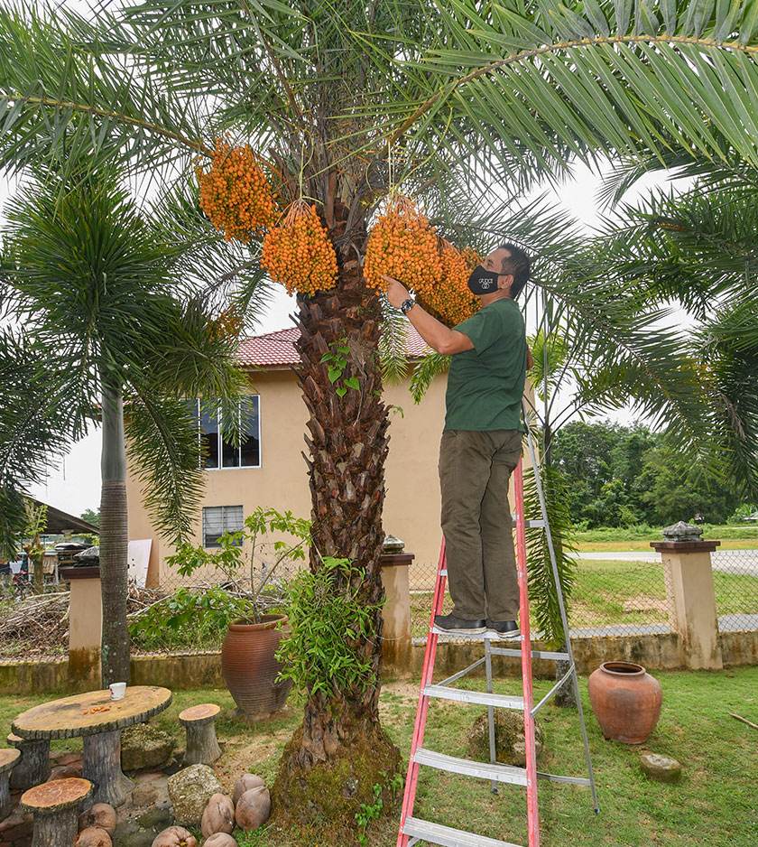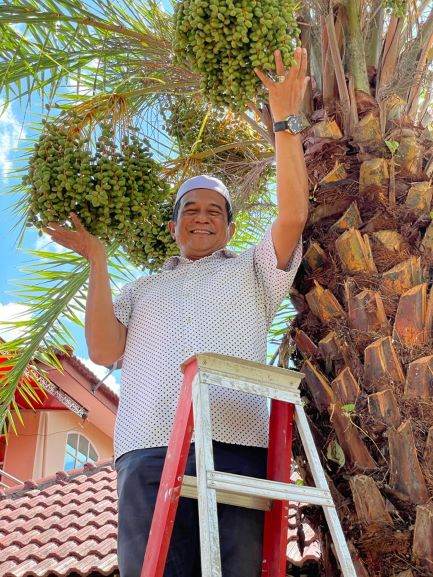 "Pada tahun pertama dan kedua pokok ada mengeluarkan buah namun kesemuanya gugur. Tahun ini hasilnya lebih baik apabila lapan tandan daripada sebatang pokok kurma sedang berbuah dan sudah hampir boleh dituai.