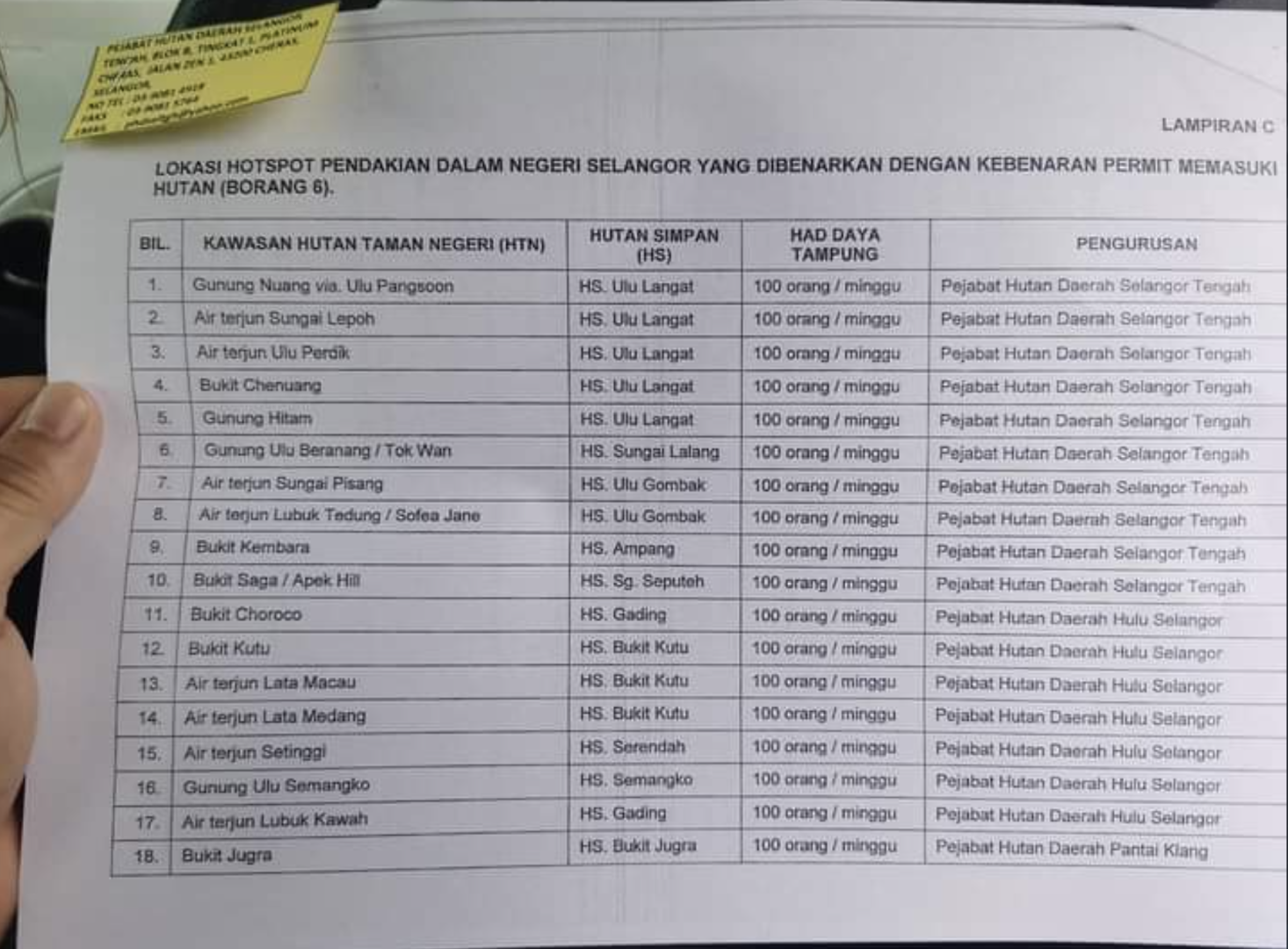 Menurut perkongsian oleh salah seorang pengguna Twitter @Jatlkhwan dimana memaparkan lampiran lokasi hotspot pendakian dalam negeri Selangor yang dibenarkan masuk dengan permit.