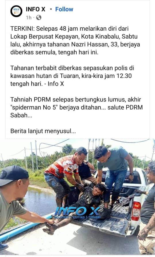 Namun, tindakan pantas dari pihak polis, tahanan yang memanjat keluar dari Lokap Berpusat Kepayan berjaya ditahan semula tengah hari tadi di kawasan hutan di Tuaran.