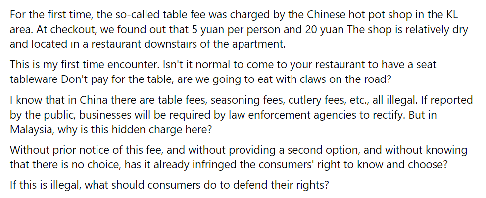 Pelanggan turut mempersoalkan, “Jika kami tidak membayar, adakah kami akan makan di jalan raya?” Selain itu, mereka turut mengeluh tiada sebarang amaran awal mengenai bayaran tempat duduk.
