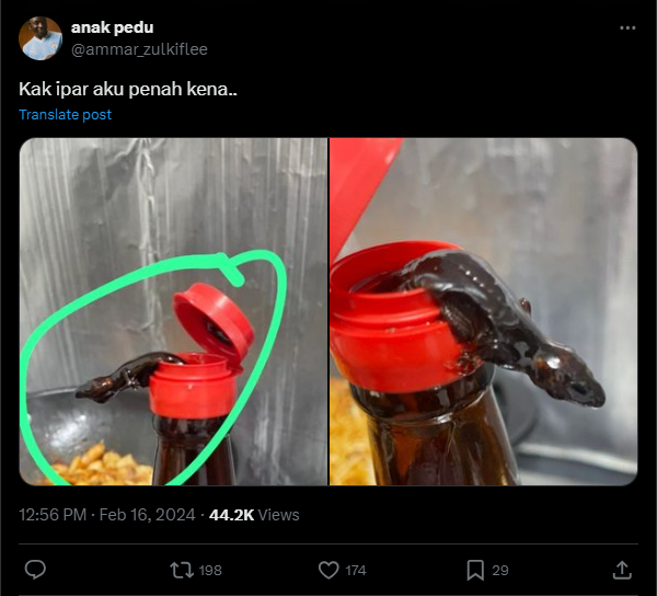 Menurut ciapan tersebut, dia mendakwa salah satu jenama kicap dari negara seberang ada bahan asing di dalam botol tersebut semata-mata untuk memekatkan kicap. Pendedahan tersebut mendapat reaksi yang meluas dan rata-rata warganet berasa takut.