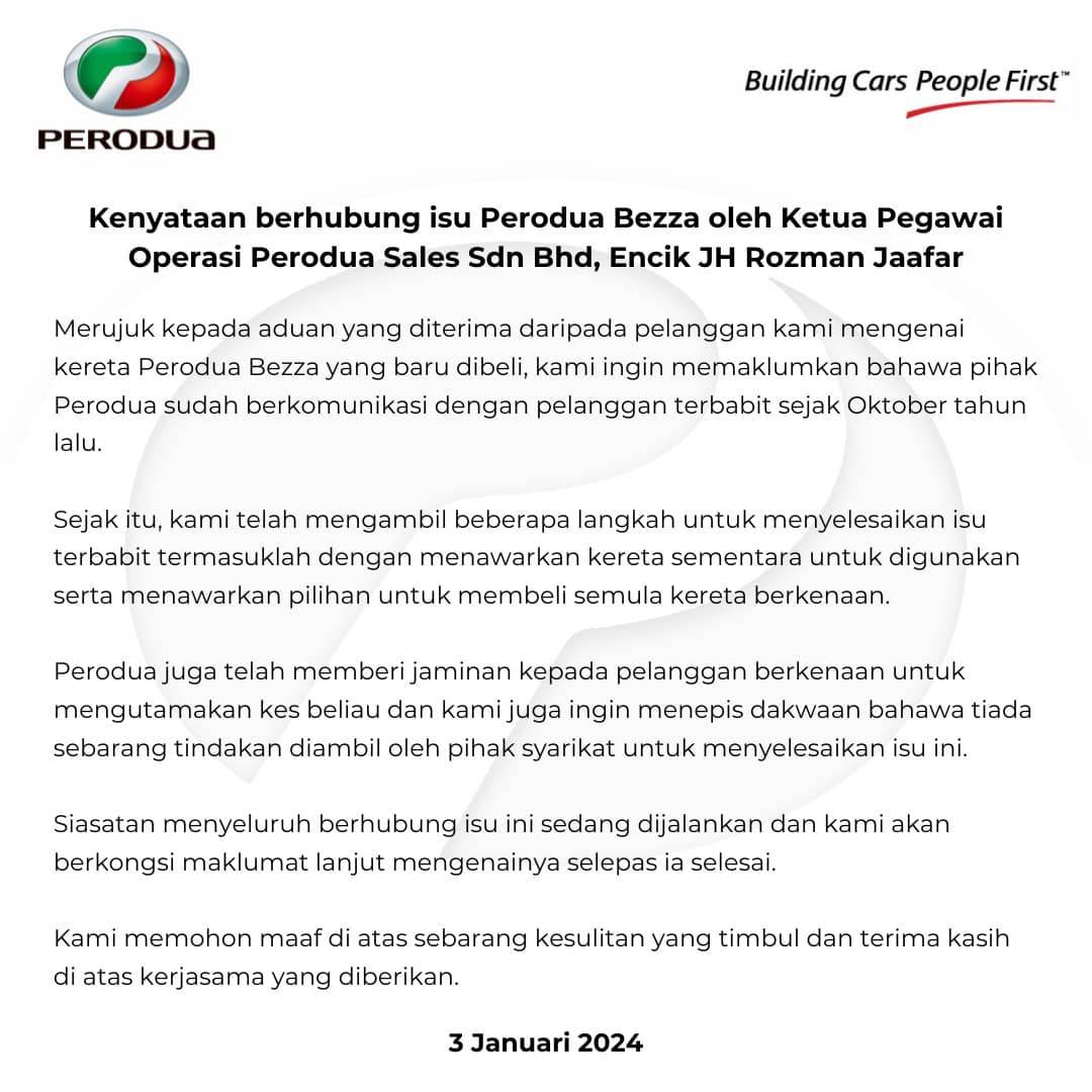 “Saya dimaklumkan Perodua sudah jawab, tapi saya nak betulkan sedikit fakta. Solusi Perodua adalah untuk saya beli kereta kedua dengan cara mengemukakan pinjaman kereta kedua.