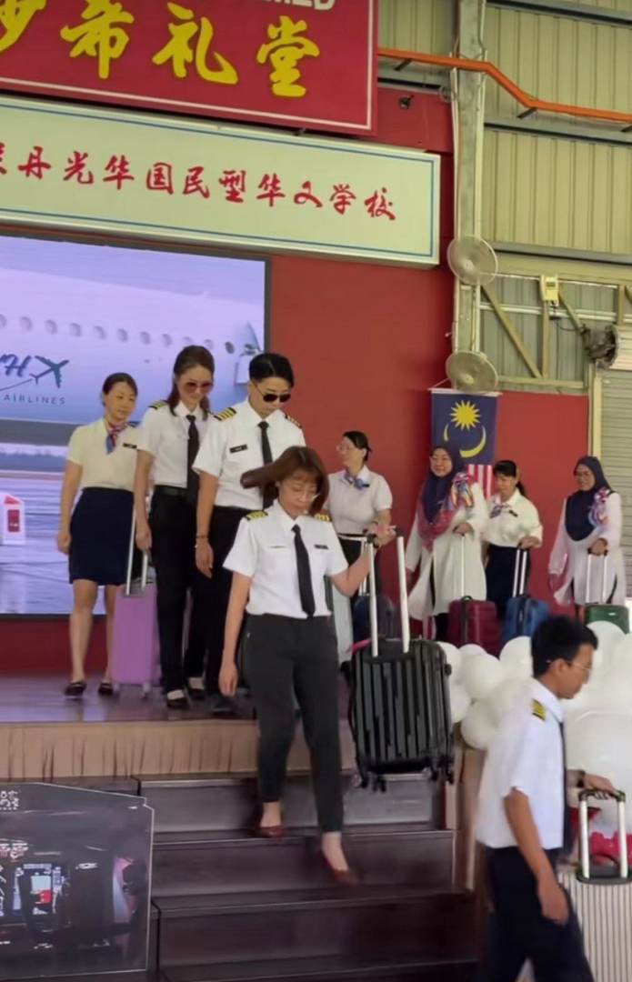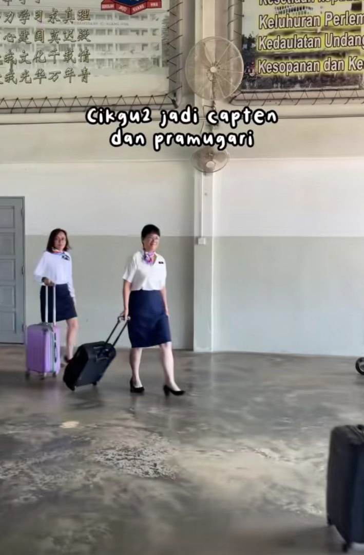 Ketibaan para tetamu disambut para guru yang memakai pakaian seragam pramugari dan juruterbang yang siap menunjukkan cara memakai jaket keselamatan.