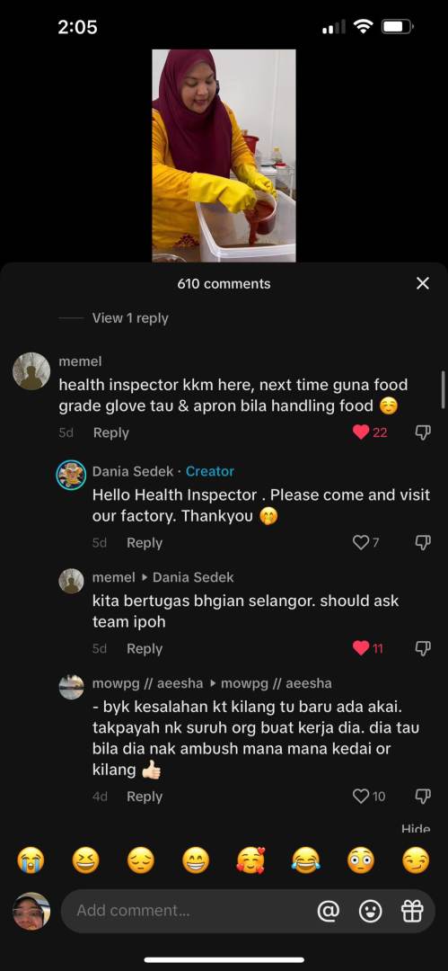 Video itu juga meraih perhatian seorang pengguna yang mendakwa dirinya sebagai pemeriksa kesihatan KKM. Individu tersebut telah meninggalkan komen yang menegur peniaga wanita itu untuk menggunakan sarung tangan yang sesuai dan memakai apron ketika mengendalikan makanan.