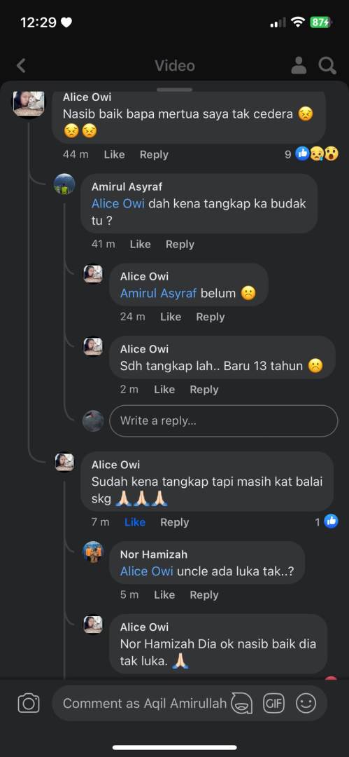 "Nasib baik bapa mentua saya tak cedera dan luka apa-apa," jelas Alice tentang situasi mangsa.