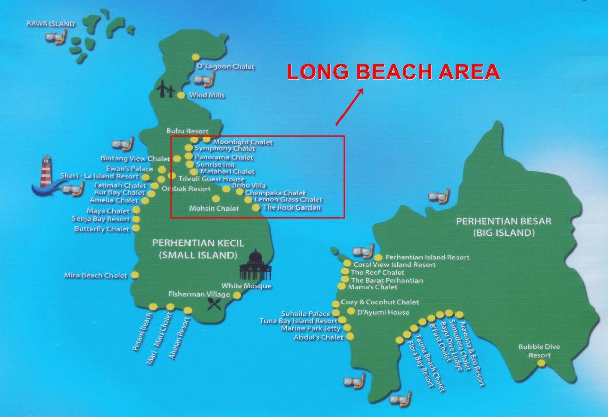 Kat sini ada macam-macam nama pantai. Paling femes Pasir Panjang / LONG BEACH. Apapun Long Beach ni tak sesuai untuk kanak-kanak dan warga emas sebab kebanyakkan penginapan yang jauh daripada Jeti dan suhu panas dia berbeza dengan lain-lain tempat di Perhentian ni. Kalau rasa nak menginap di Long Beach juga tu boleh, tapi fulusnya mestilah lebih.