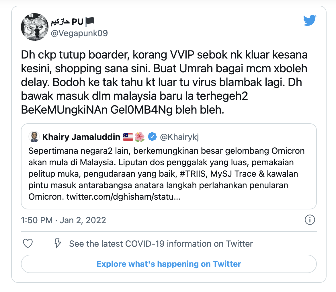 Sejak pengumuman tentang penangguhan sementara kebenaran perjalanan untuk menunaikan ibadah umrah bermula 8 Januari ini nampaknya telah membuat para netizen mula bengang dengan kawalan pintu negara yang masih lagi membuka pintu terutama kepada mereka yang keluar ke destinasi "orang kaya" seperti London.