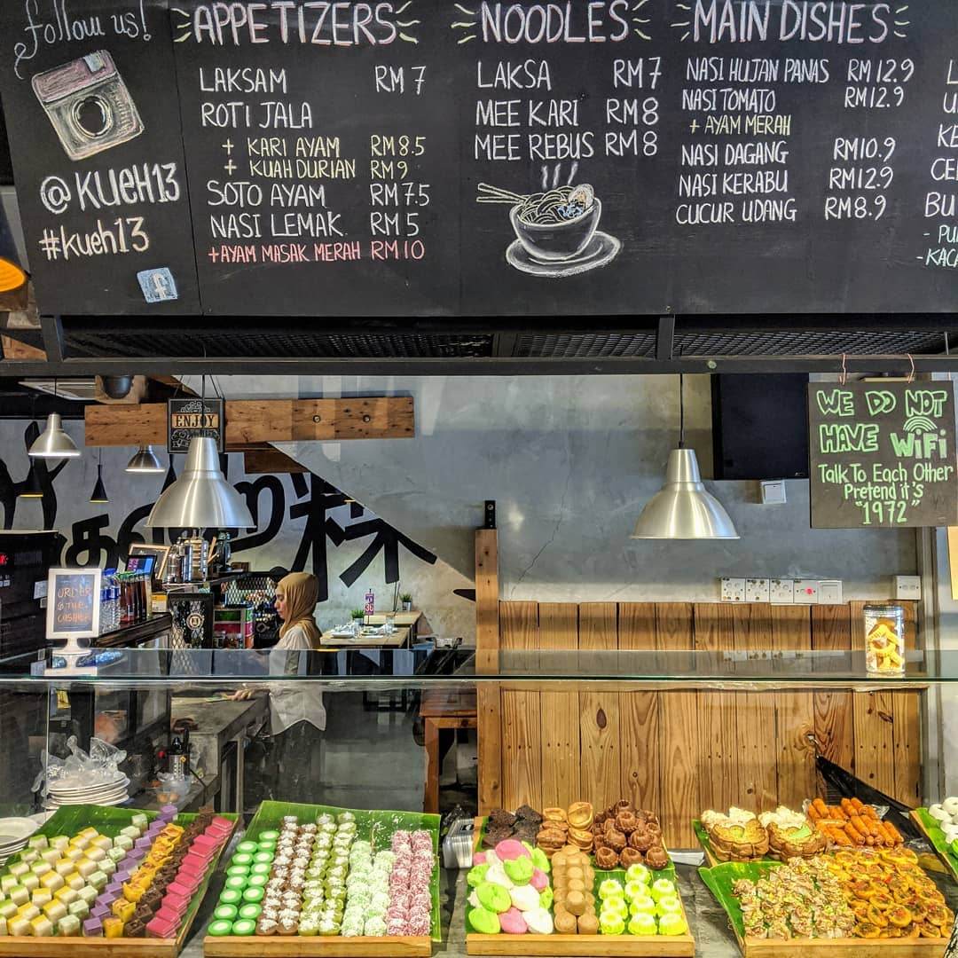 Mari menikmati kudap-kudapan di waktu pagi! Kueh@Seksyen 13 menawarkan lebih 40 jenis kuih muih tempatan yang dibuat setiap hari. Terdapat manis-manisan yang enak, kafe ini dibuka dari jam 10 pagi hingga 8 malam, tersedia untuk sarapan pagi dan minuman petang! Terdapat juga pelbagai pilihan makanan berat di sini, seperti Laksa Utara, Nasi Lemak Ayam Berempah dan Nasi Tomato!