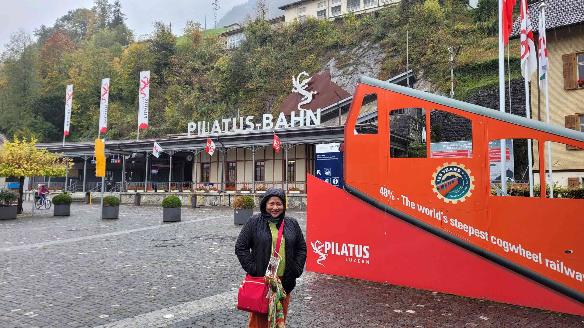 Satu lagi pengalaman baru bagi saya ialah menaiki kereta api elektrik roda gerigi (cogwheel) paling curam di dunia mendaki Gunung Pilatus.