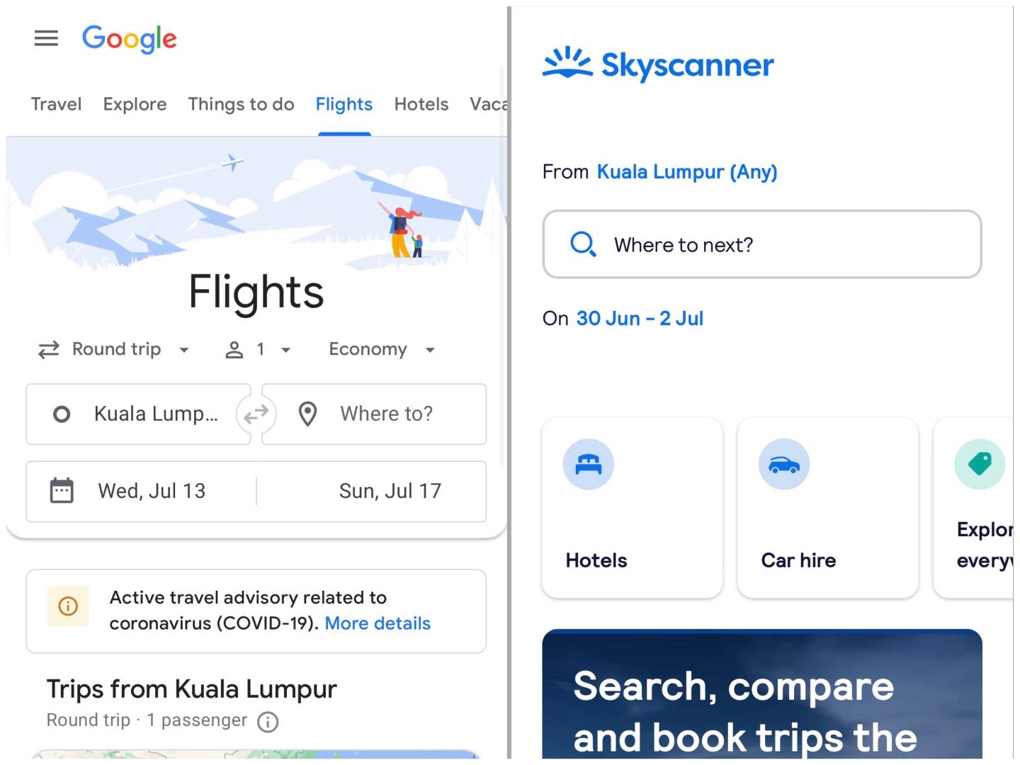 1. Layari website seperti Google Flights & Skyscanner untuk buat perbandingan harga dan cari waktu yang paling murah & tepat untuk terbang.