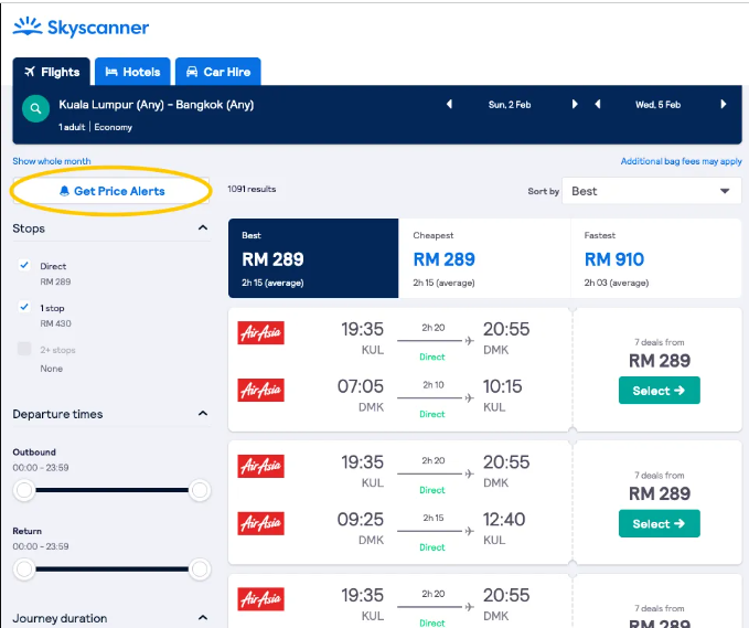 5. Tekan butang 'on' untuk 'Price Alert Notification' di website seperti Skyscanner untuk dapat notifikasi secara langsung perubahan harga tiket destinasi.