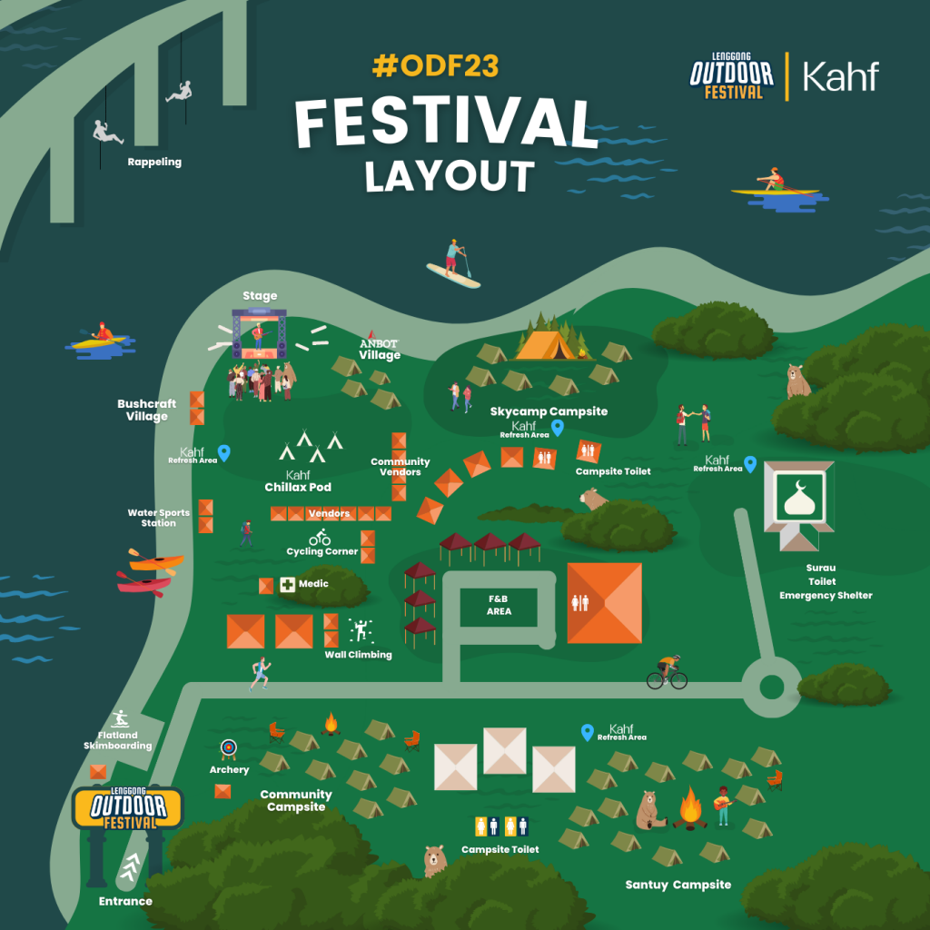 Namun jangan bersedih sebab korang masih boleh menyewa tapak perkhemahan di SANTUY CAMPSITE. Kalau korang memang dah ada segala peralatan perkhemahan korang cuma perlu sewa tapak sahaja di sana. Tetapi jika tiada pun korang jangan risau kerana di ODF23 ada menyediakan khidmat sewaan peralatan perkhemahan khas untuk korang! Settle bab penginapan di tapak festival!