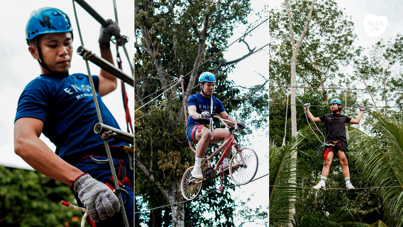 Dikelilingi alam semulajadi yang menghijau -- korang akan lebih tenang dan seronok melakukan 7 halangan berbeza seperti Bicycle / Sky Ride, Multivine, Trolley, Zipline, Broken Bridge, Tree Hugging dan diakhiri dengan Fly & Drop menyusuri sungai yang ada di Rumah Hutan Bonda Rozita.