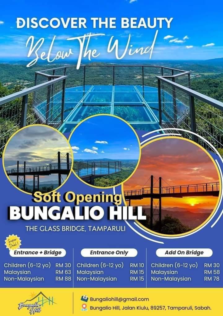 Terletak di Bungalio Hill, Kiulu -- jambatan kaca tersebut yang dikatakan pertama seumpamanya di Sabah telah dibuka untuk kunjungan orang ramai.