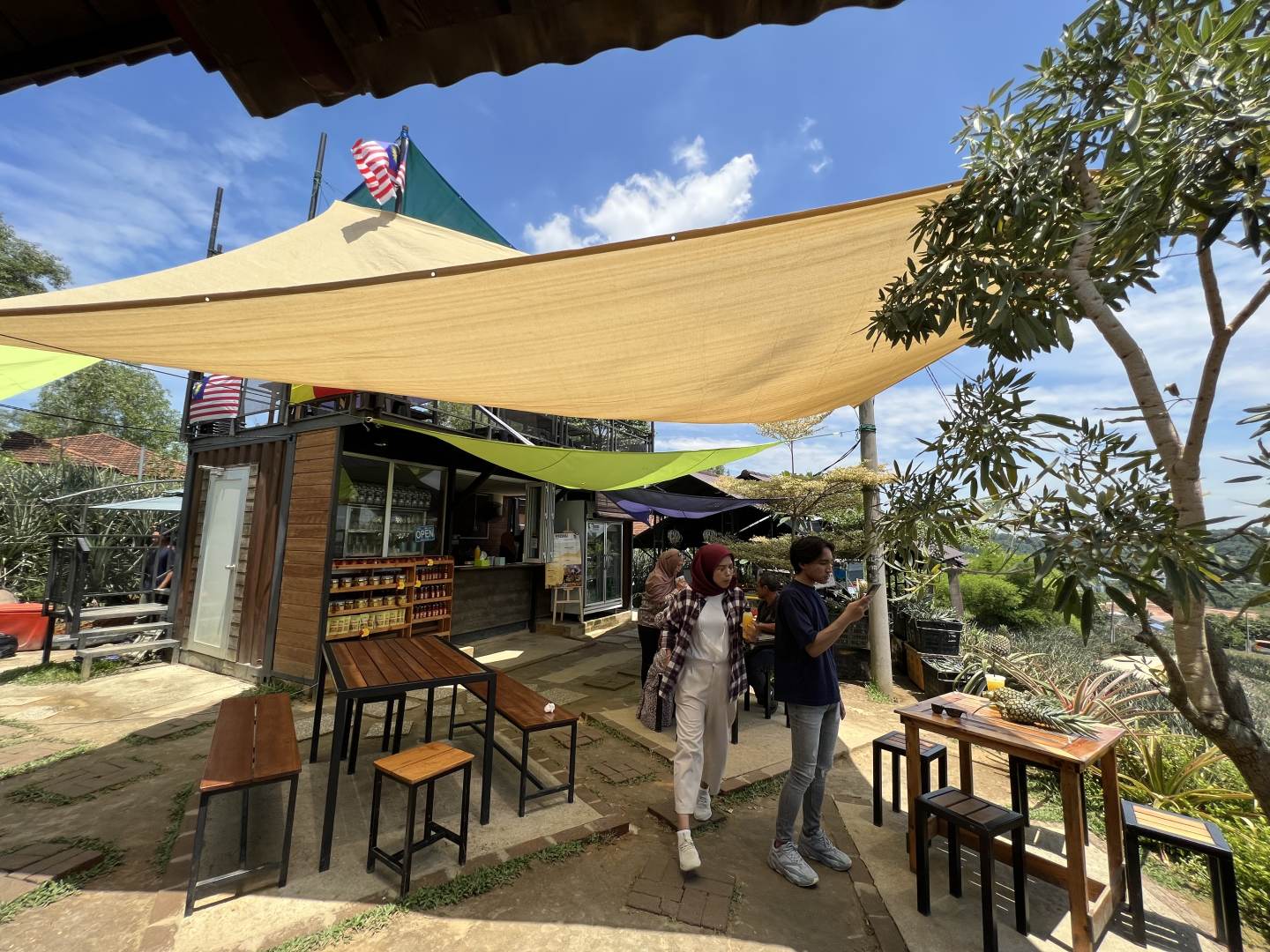 Kafe yang terletak di puncak bukit dalam ladang tersebut menjadikan pemandangan sangat cantik untuk kita nikmati semasa makan. Selepas makan, jangan lupa untuk dapatkan nanas segar yang dijual murah berbanding harga di pasaran. Tidak lupa juga terdapat produk lain yang berasaskan nanas seperti sos cili nanas dan sebagainya.