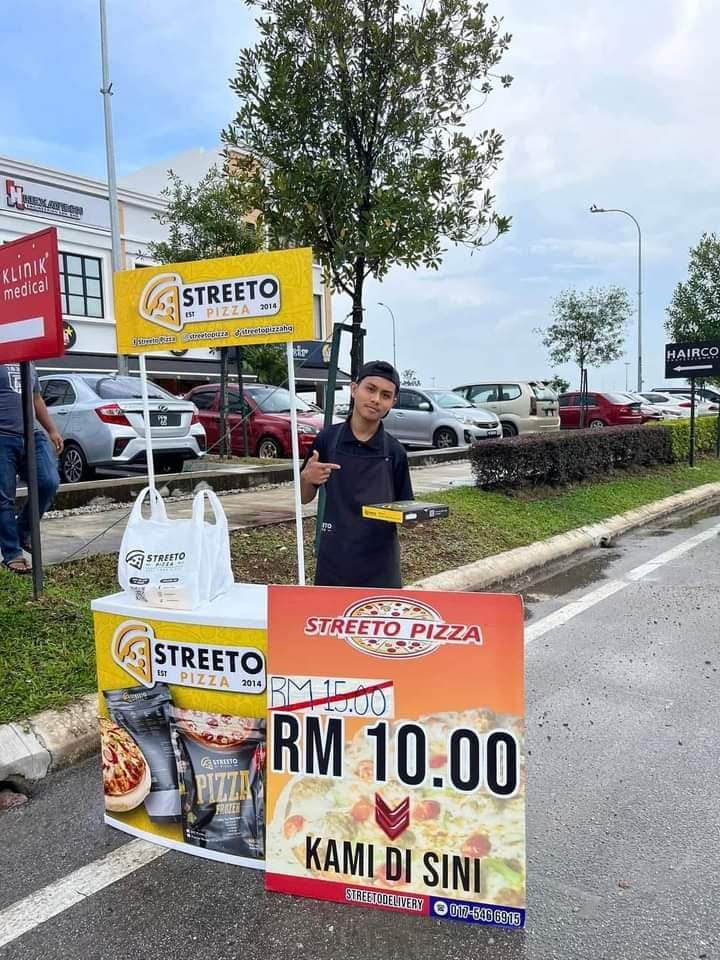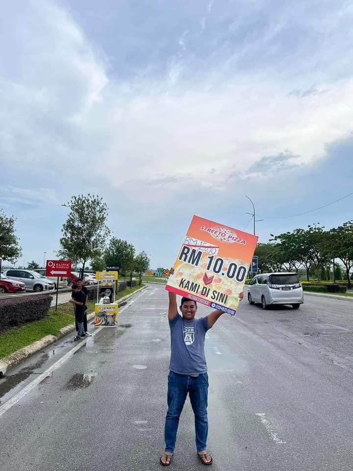Individu tersebut turut memuat naik beberapa keping gambar yang memaparkan aksi berani dua penjaja piza yang memegang sepanduk dan duduk di meja kiosk yang diletakkan di bahu jalan.