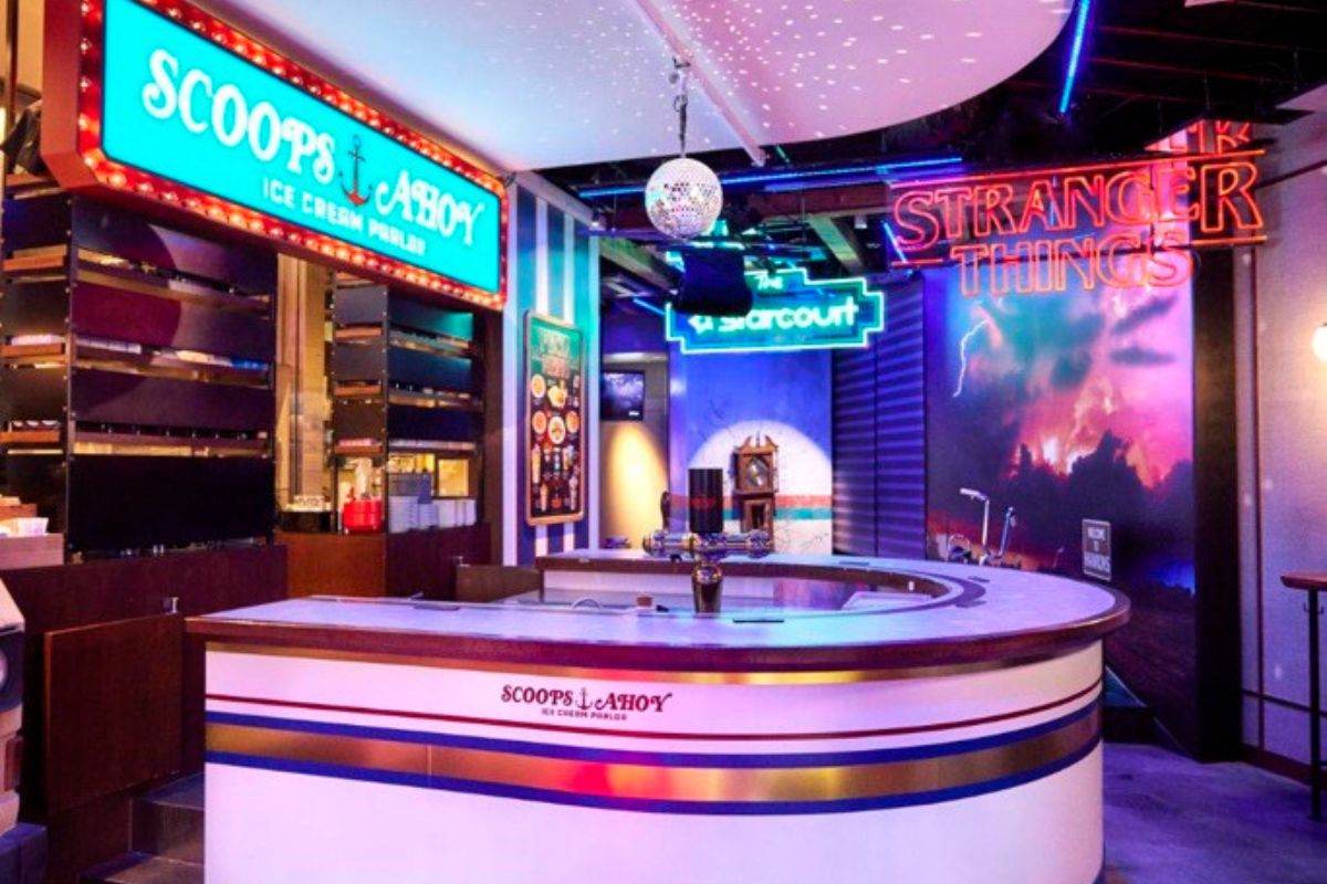 Bahagian dalam kafe itu mempunyai replika kedai dan set daripada rancangan itu yang digambarkan seperti berada di bandar Hawkins, Indiana. Ia turut mempunyai ‘dunia cermin gelap’ yang dipanggil ‘Terbalik’.