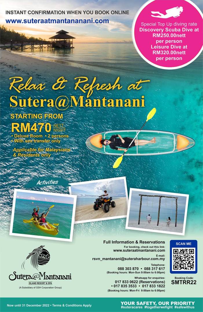 TRAVELSutera@Mantanani terletak di sebuah pulau yang mempunyai pantai yang cukup bersih dan merupakan permata tersembunyi di Negeri Sabah. Mempunyai keajaiban alam semulajadi serta kaya dengan hidupan marin menjadikan ianya sebagai destinasi sesuai untuk bersantai bersama yang tersayang.