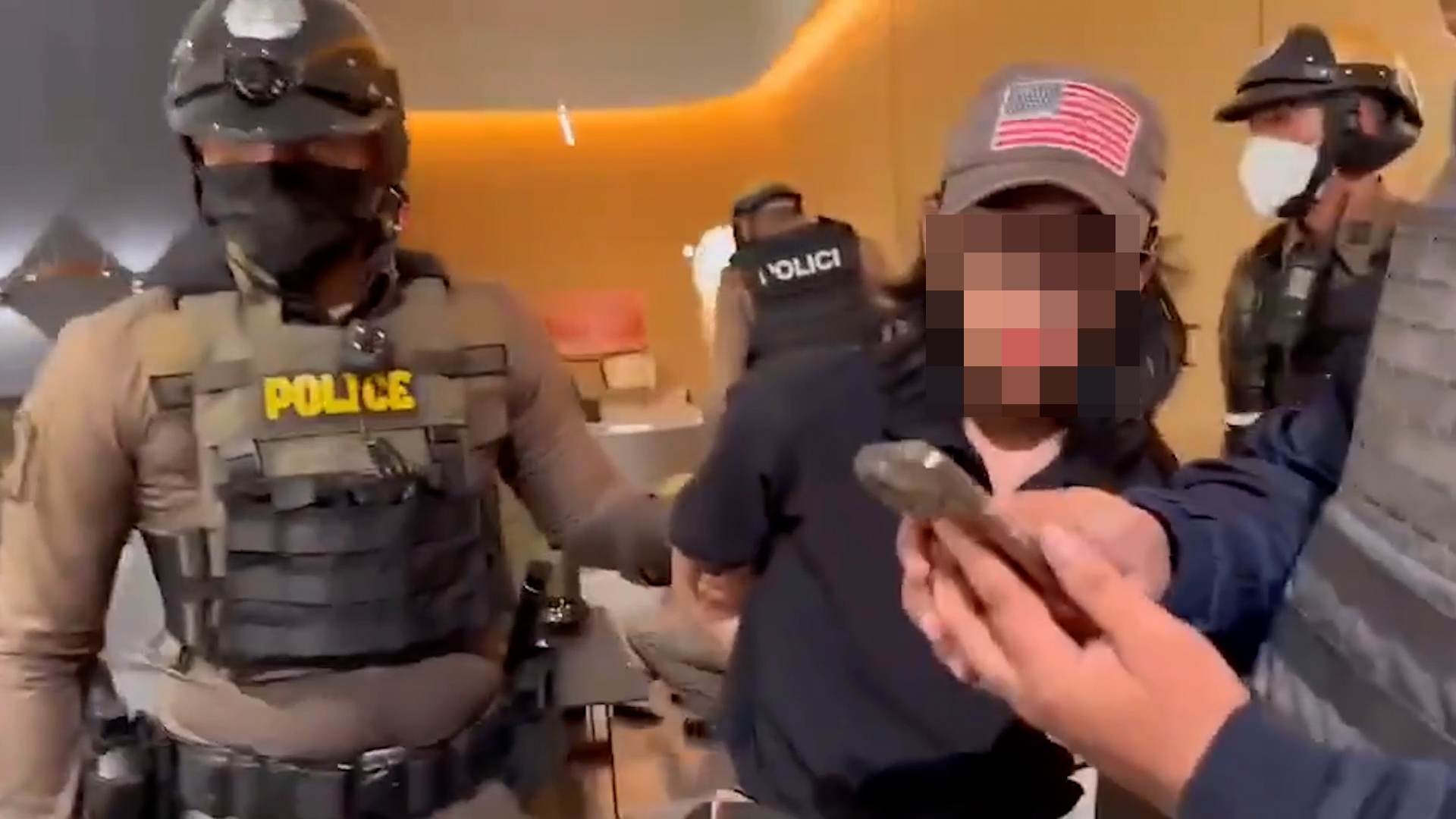 Perkhidmatan kecemasan berkongsi gambar anggota polis menggari seorang individu yang meniarap dan seorang lagi anggota polis merampas sepucuk pistol di atas lantai.