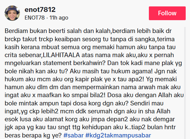 "Yang memaki hamun aku dalam DM (direct message) dan mempermainkan nama arwah mak aku, ingat aku tak maafkan kau sampai bila-bila" ujar Enot kecewa dengan warganet yang memaki hamun dan melemparkan tuduhan begitu kepadanya.