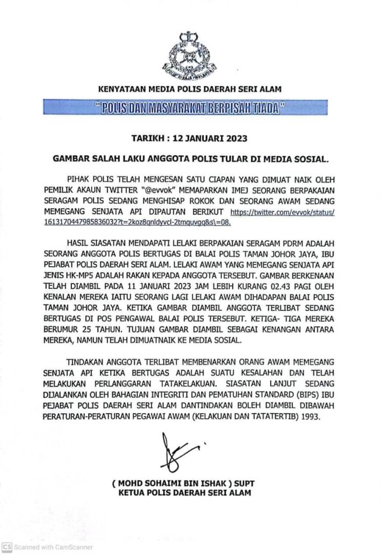 Ketua Polis Daerah Seri Alam, Superintendan Mohd Sohaimi Ishak berkata, polis mengesan gambar yang dimuat naik di Twitter yang menggunakan akaun @evvok, memaparkan seorang lelaki memakai uniform polis sambil menghisap rokok, manakala orang awam di sebelahnya memegang senjata api.