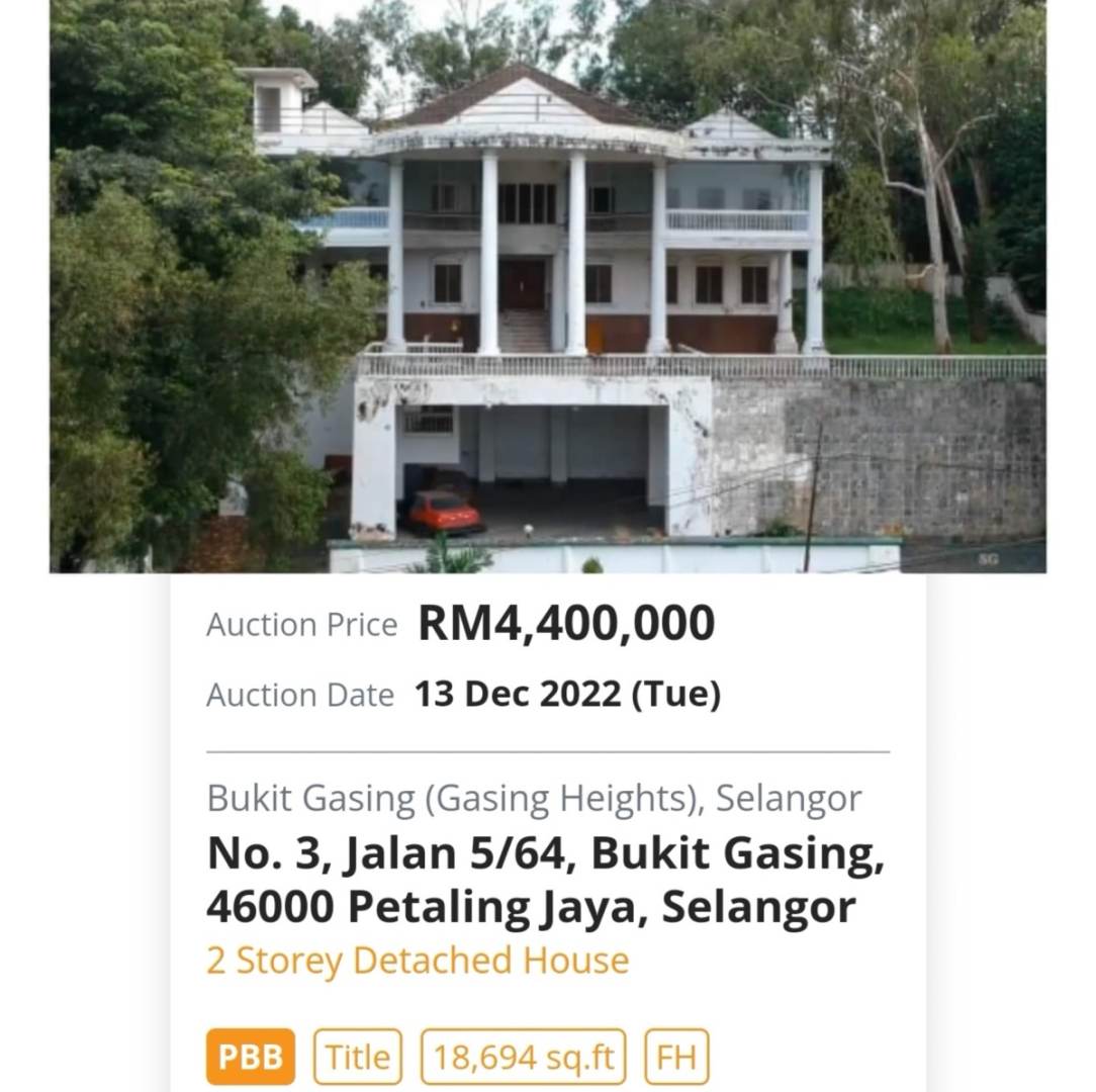Menurut laman Facebook Selangor Auction Property, hartanah itu bakal dilelong dengan harga RM4.4 juta pada 13 December 2022.