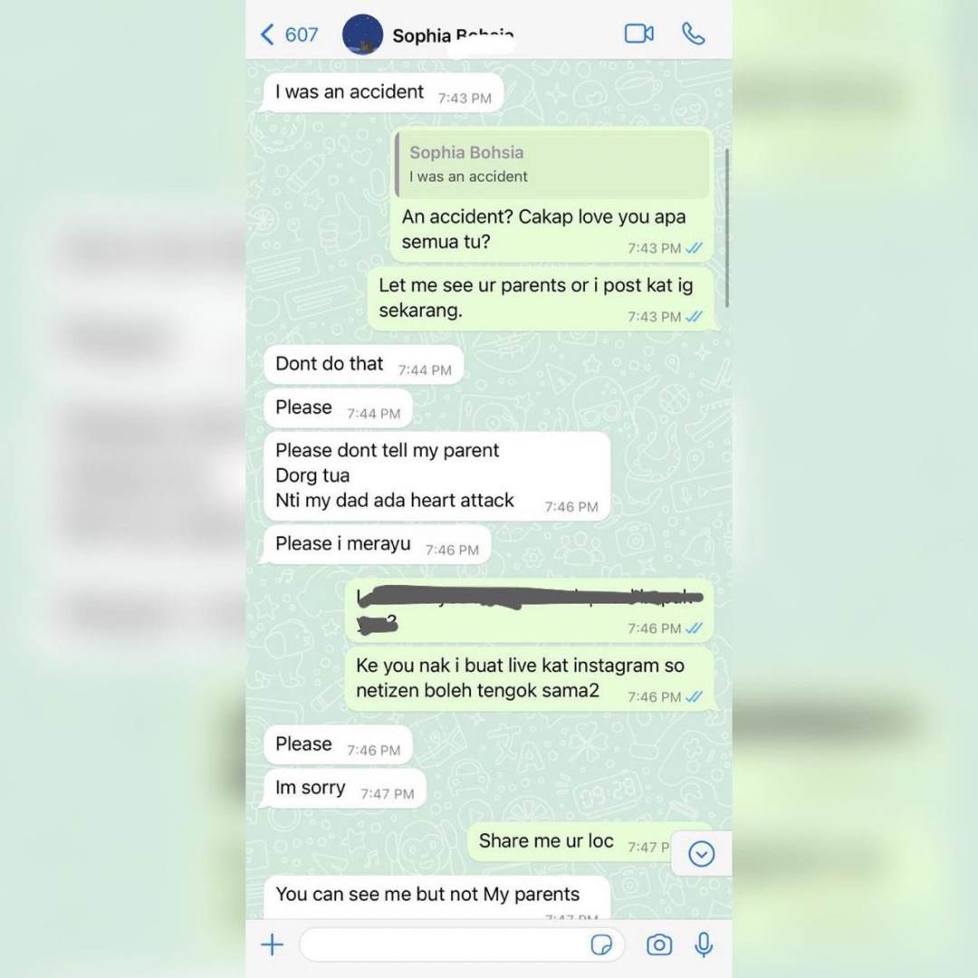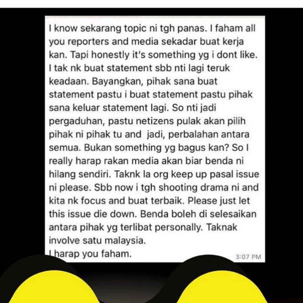 Berdasarkan posting Bella, Sophia juga merayu agar perkara ini tidak diperpanjangkan kepada keluarganya khuatir bakal memberi impak kesihatan terdapat bapanya. Moga konflik ini dapat diselesaikan dengan matang dan segera.