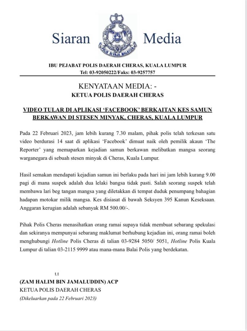 "Orang ramai boleh menghubungi Hotline Polis Cheras di talian 03-92845050/5051, Hotline Polis Kuala Lumpur di talian 03-21159999 atau mana-mana balai polis berhampiran bagi membantu siasatan," katanya.