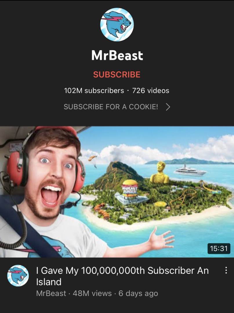 Dia memuat naik sebuah video bertajuk I Give My 100,000,000th Subscriber A Private Island, yang menyaksikan Donaldson menerbangkan 100 orang subscriber ke sebuah lokasi untuk bersaing mendapatkan kunci ke pulau persendirian itu.