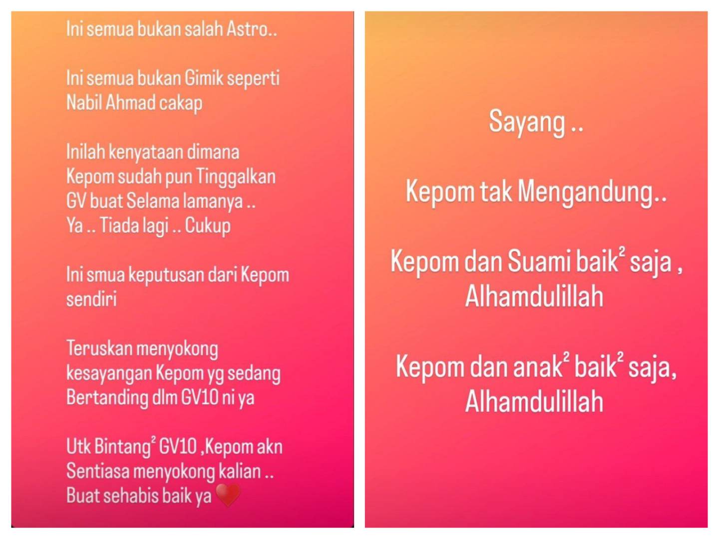 “Kepom tidak mengandung. Kepom dan suami baik-baik sahaja. Alhamdulillah, Kepom dan anak-anak baik-baik sahaja," pesannya.