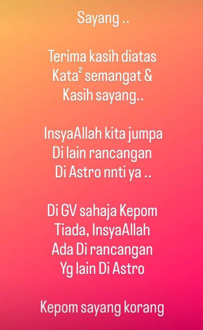 “Terima kasih di atas kata-kata semangat dan kasih sayang. Di Gegar Vaganza sahaja Kepom tiada, InsyaAllah kita jumpa di lain rancangan di Astro nanti ya,” ujarnya.