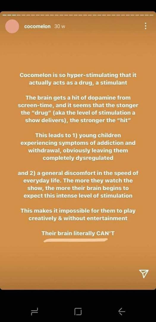 Ini kerana kartun itu dikategorikan sebagai hyper-stimulating yang mana pendedahan visual dan auditori secara berlebihan bertindak seperti dadah (stimulant) kepada otak si kecil.