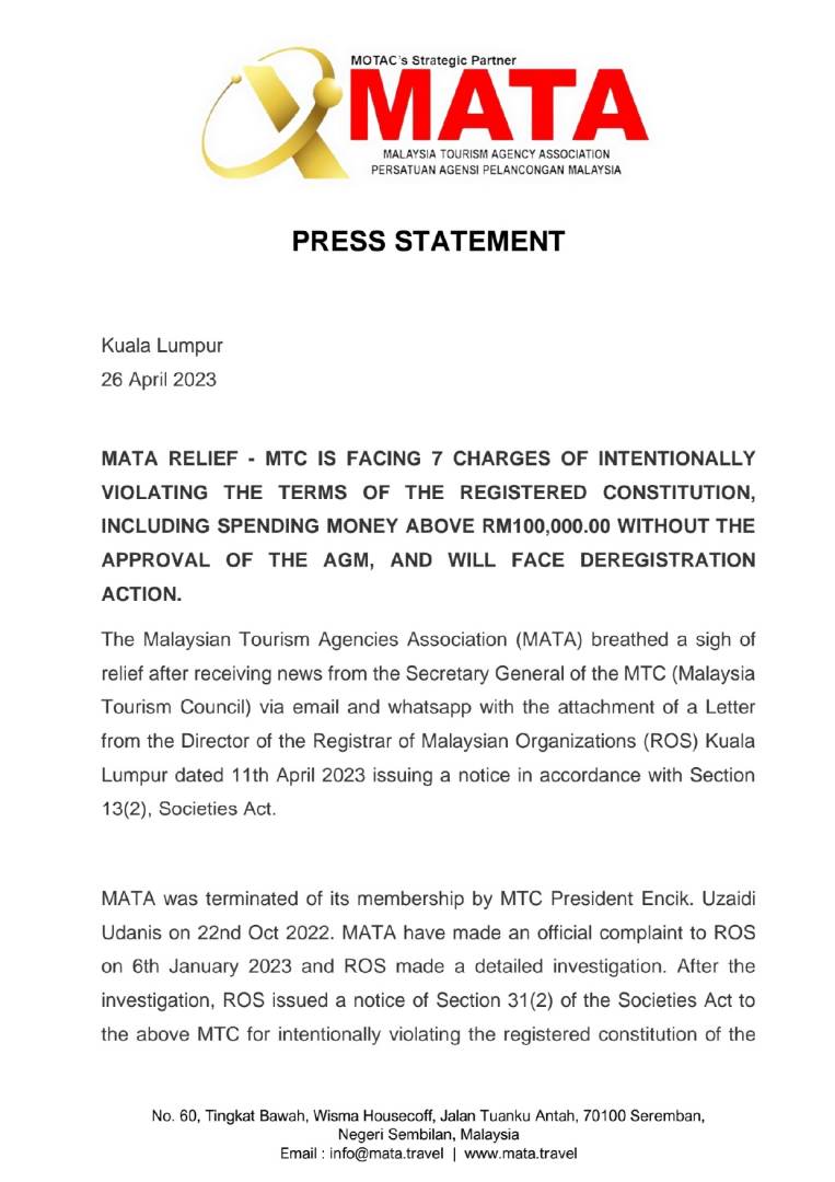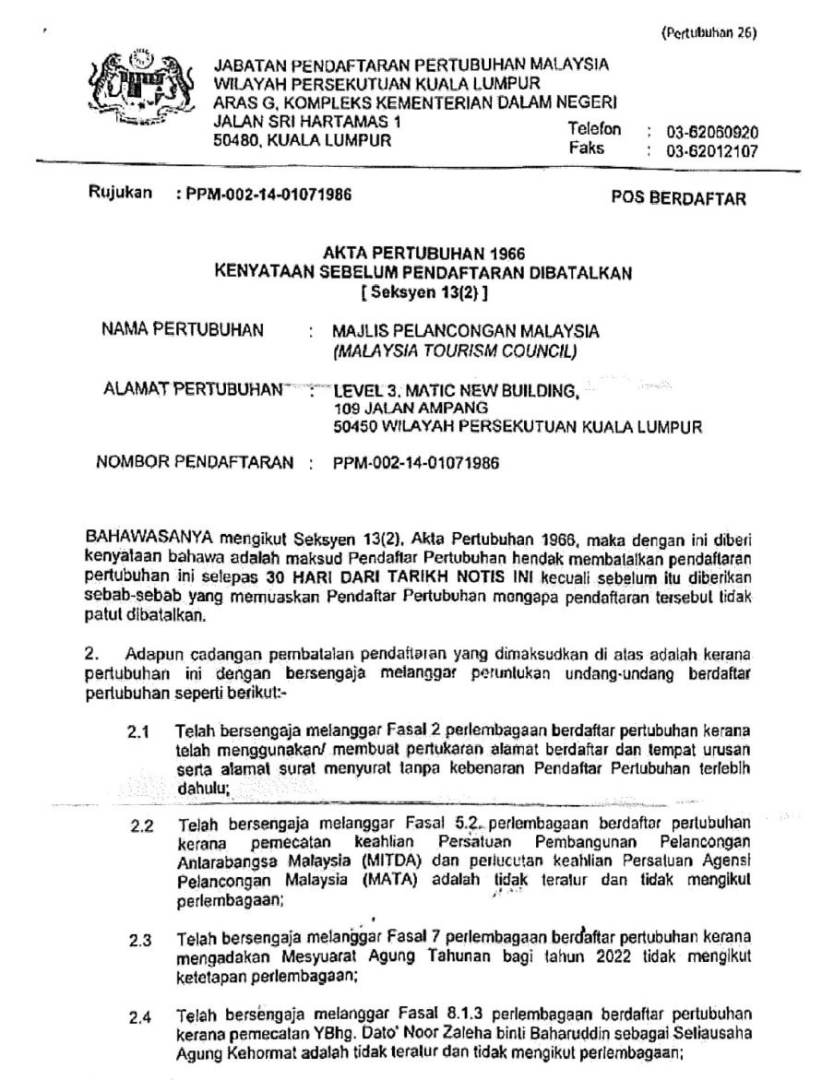 Sehinggakan pertubuhan pelancongan berkenaan bakal berdepan tindakan pembatalan pendaftaran daripada Jabatan Pendaftaran Pertubuhan Malaysia (ROS) dalam satu surat bertarikh 1 April 2023.