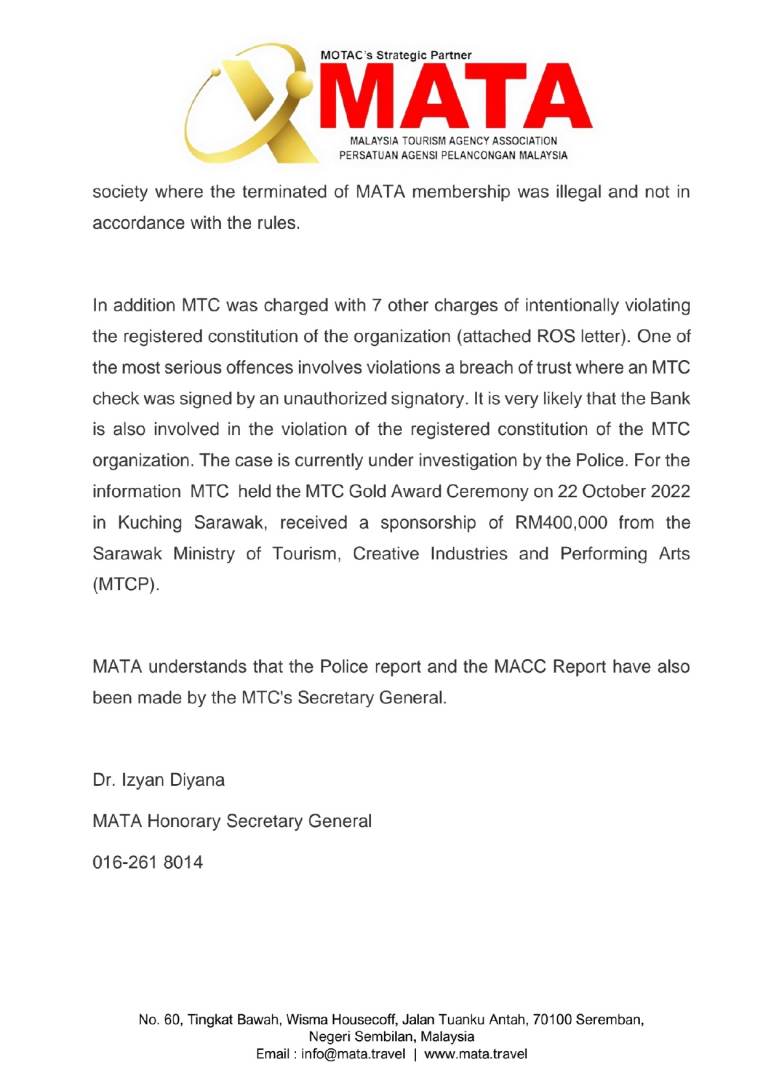 3. Membatalkan Keahlian Persatuan Agensi Pelancongan Malaysia (MATA) dan Persatuan Pembangunan Pelancongan Antarabangsa Malaysia (MITDA) Secara Tidak Sah