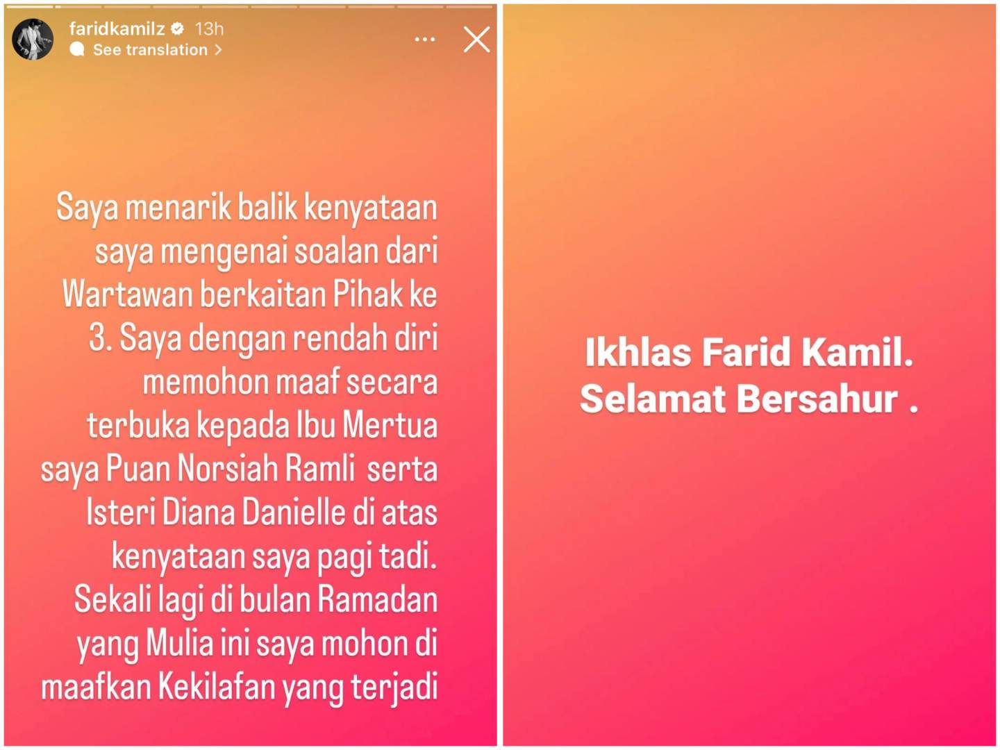 Melalui hantaran Instagram (IG), malam tadi, Farid atau nama penuh, Farid Kamil Zahari, 42, memberitahu, dia menarik balik kenyataan yang disifatkan ada hubung kait dengan pihak ketiga.