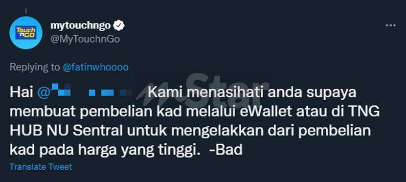 "Kami menasihati anda supaya membuat pembelian kad melalui Wallet atau di TnG HUB NU Sentral untuk mengelakkan dari pembelian kad pada harga yang tinggi," tulis pengendali Twitter itu menerusi satu ciapan.