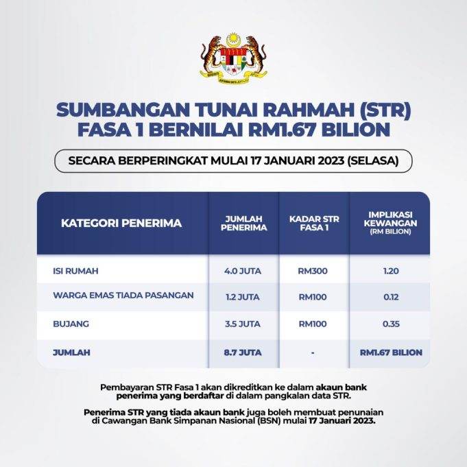Mulai hari ini (17 Januari 2023) -- pembayaran STR Fasa 1 akan diagihkan kepada penerima isi rumah sebanyak RM300 manakala bagi warga emas yang tiada pasangan dan bujang masing-masing RM100.