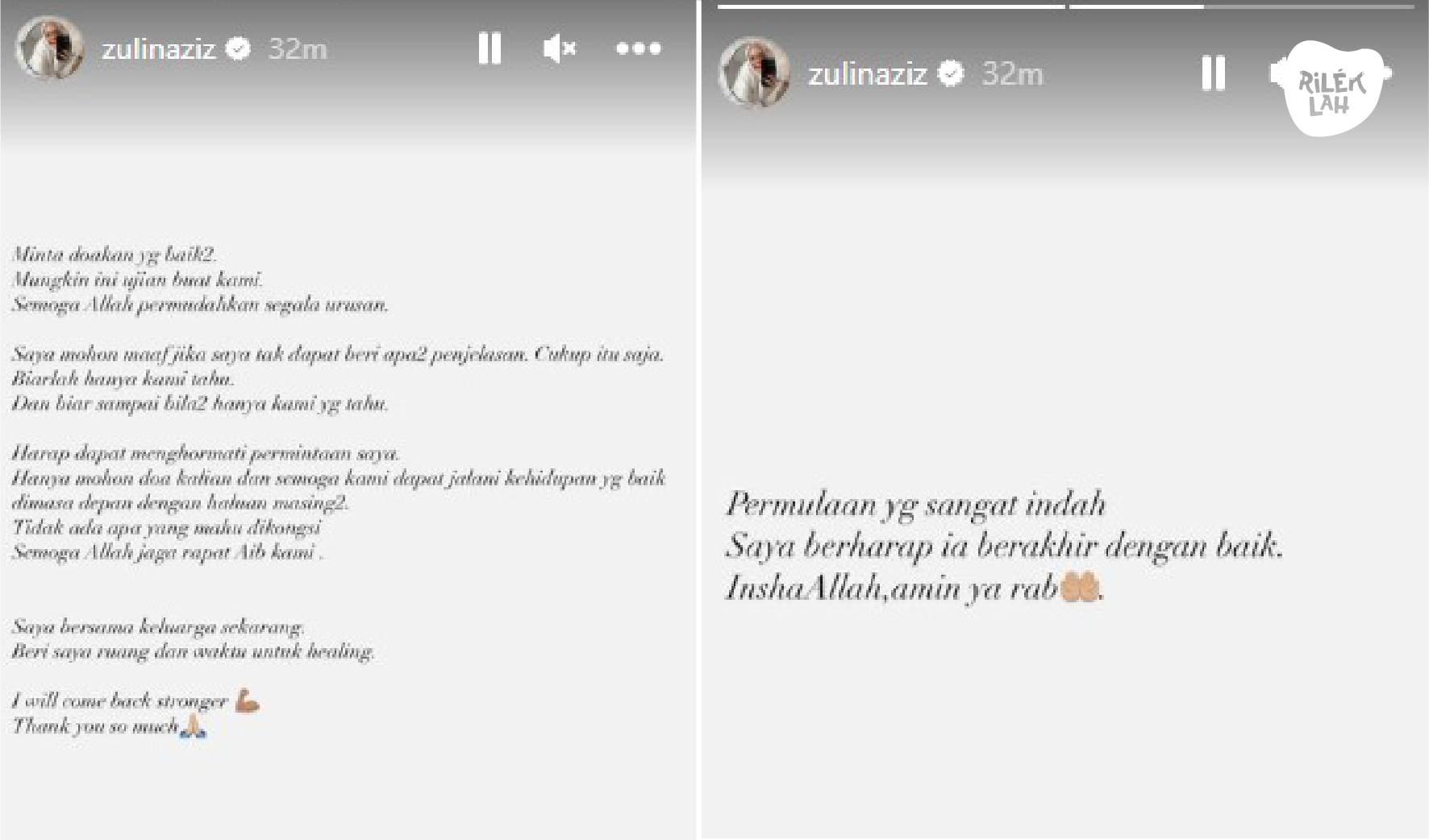Terbaharu -- pengacara dan pelakon, Zulin Aziz memuat naik gambar di Instagram dengan kapsyen yang menggambarkan seolah-olah hubungan dengan suami sudah berakhir.