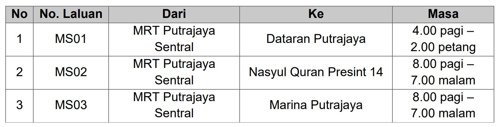 Perkhidmatan itu akan berlepas setiap jam dari Stesen MRT Kajang bermula pukul 5.30 pagi sehingga 1.30 petang manakala laluan dari Putrajaya Sentral akan bermula pada 6.30 pagi sehingga 2.30 petang dengan tambang RM1.00.