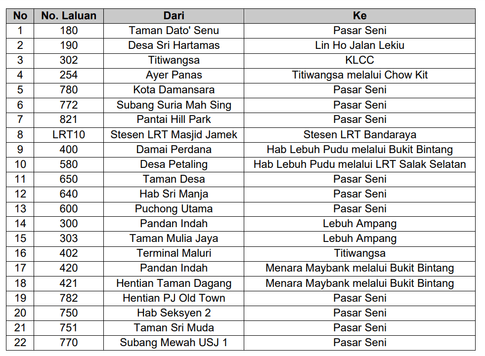 Begitu juga dengan 101 laluan bas Rapid KL. Rujuk laman web Rapid KL untuk senarai bas yang terlibat.