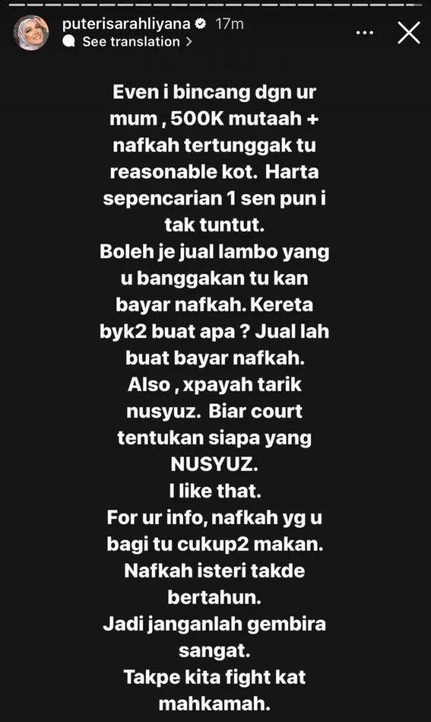 Puteri Sarah mendakwa nafkah yang diberikan untuk anak-anaknya itu hanya cukup-cukup makan manakala nafkah buatnya pula sudah lama tidak diberikan.