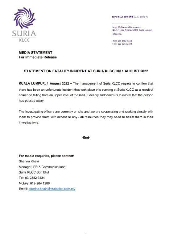“Dukacita dimaklumkan pihak pengurusan Suria KLCC mengesahkan seorang individu maut dalam insiden terbabit,” katanya.