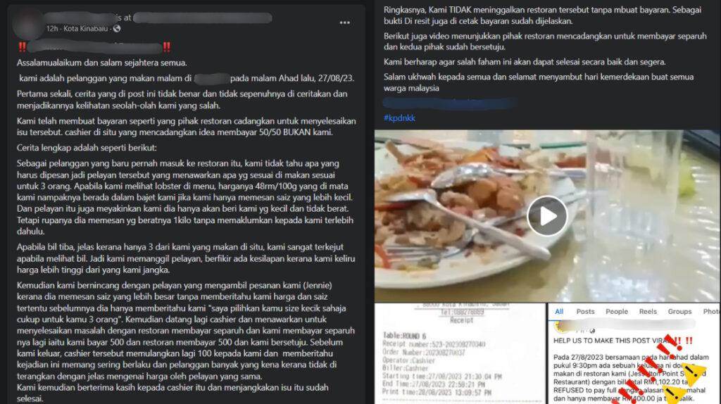 TERKINISeorang pemilik restoran makanan laut di Sabah berang apabila pelanggannya bertindak untuk tidak mahu membayar makanan yang dipesan sejumlah RM1,102.20 dengan alasan terlalu mahal.