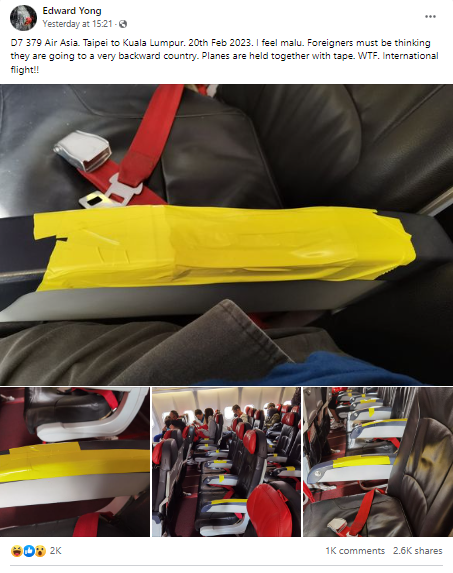 TERKINIHangat menjadi bualan netizen apabila seorang pengguna Facebook memuatnaik beberapa keping gambar kerusi pesawat penerbangan Air Asia yang dipenuhi dengan pita pelekat kuning baru-baru ini,